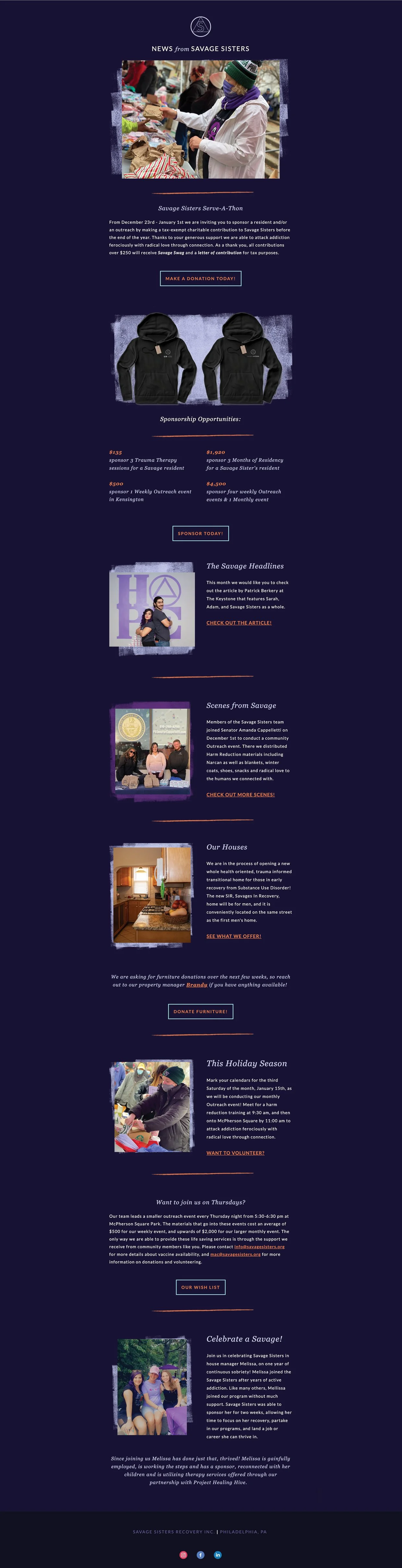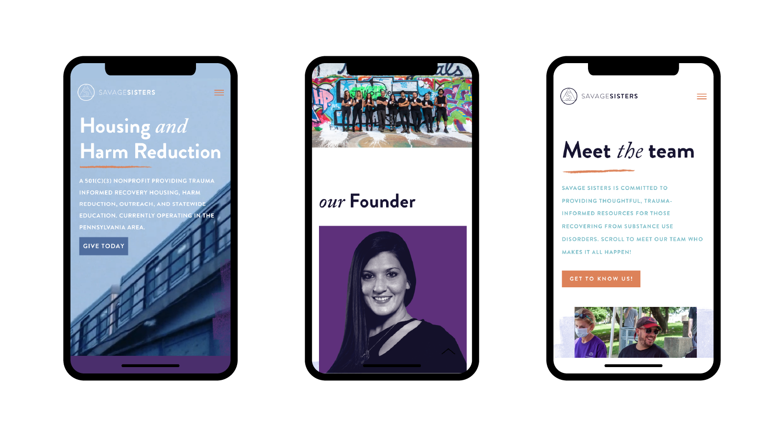 Dedicated to Philadelphia's community, Savage Sisters provides essential support for individuals affected by substance use disorder. As part of their expansion efforts, a custom website was developed to articulate the organization's mission, encourage volunteering, and spotlight team members. Featuring imagery of trauma-informed recovery housing and details on statewide education initiatives, the website, and socials also feature engaging animations and dynamic digital campaigns as additional deliverables.