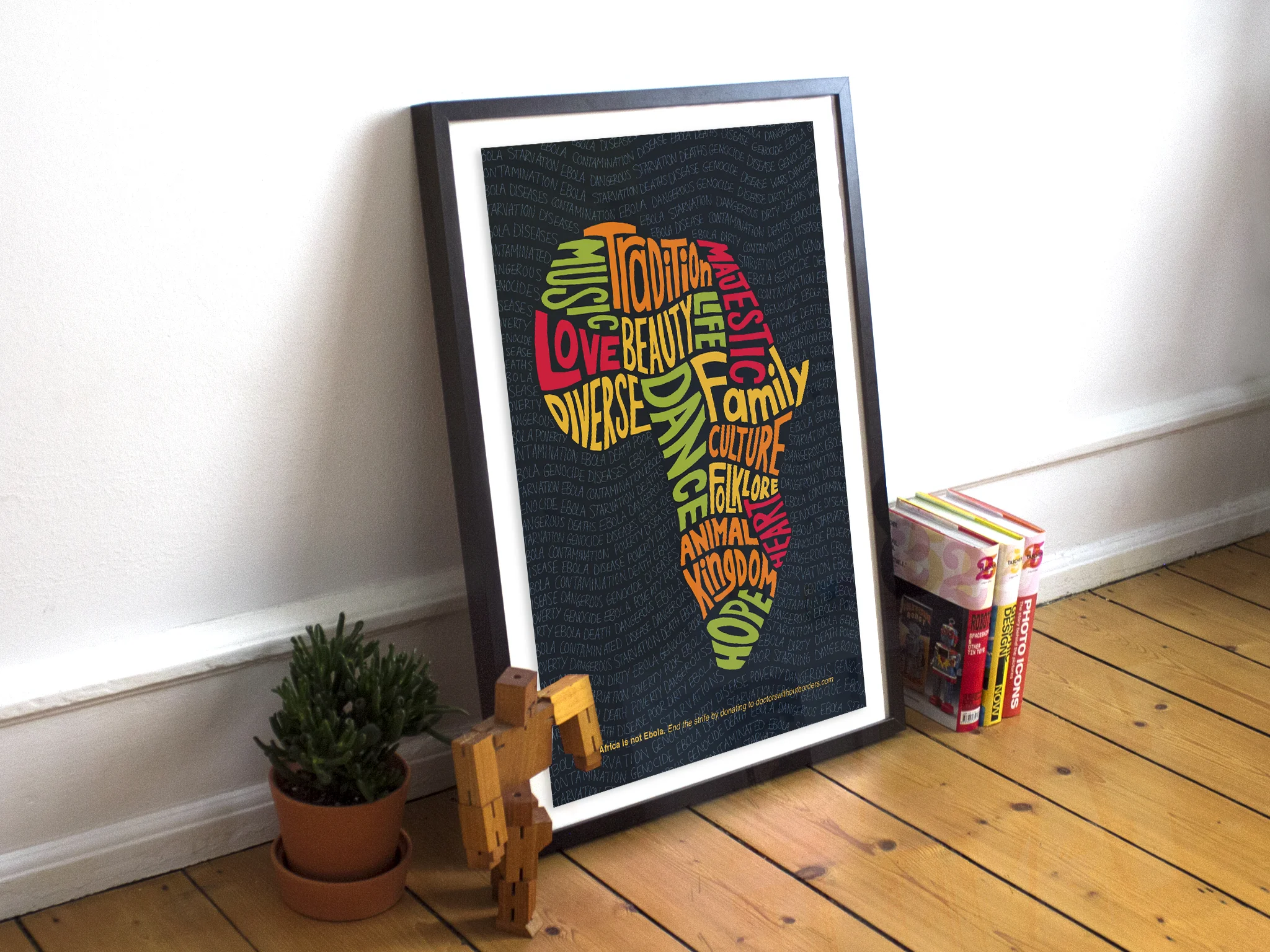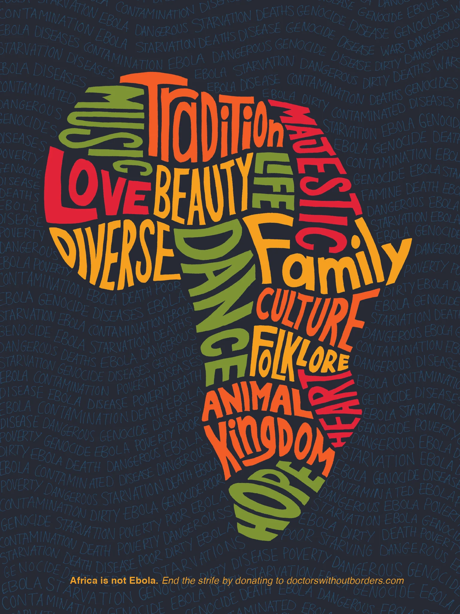 Africa is not Ebola is a poster I created for an online campaign and traveling show called "Posters Against Ebola," where proceeds are donated to doctors without borders. Using a hand-done treatment, I created a typographic image of Africa that highlights the positive aspects of this country. I used bright colors for the type to create a bold image that mimics the bold message. I also wanted to cover the whole page up with type, so even the water around the country is made up of the negative words associated with Africa, so if you look closely you can see words like "Ebola" and "Disease" swimming around the country.